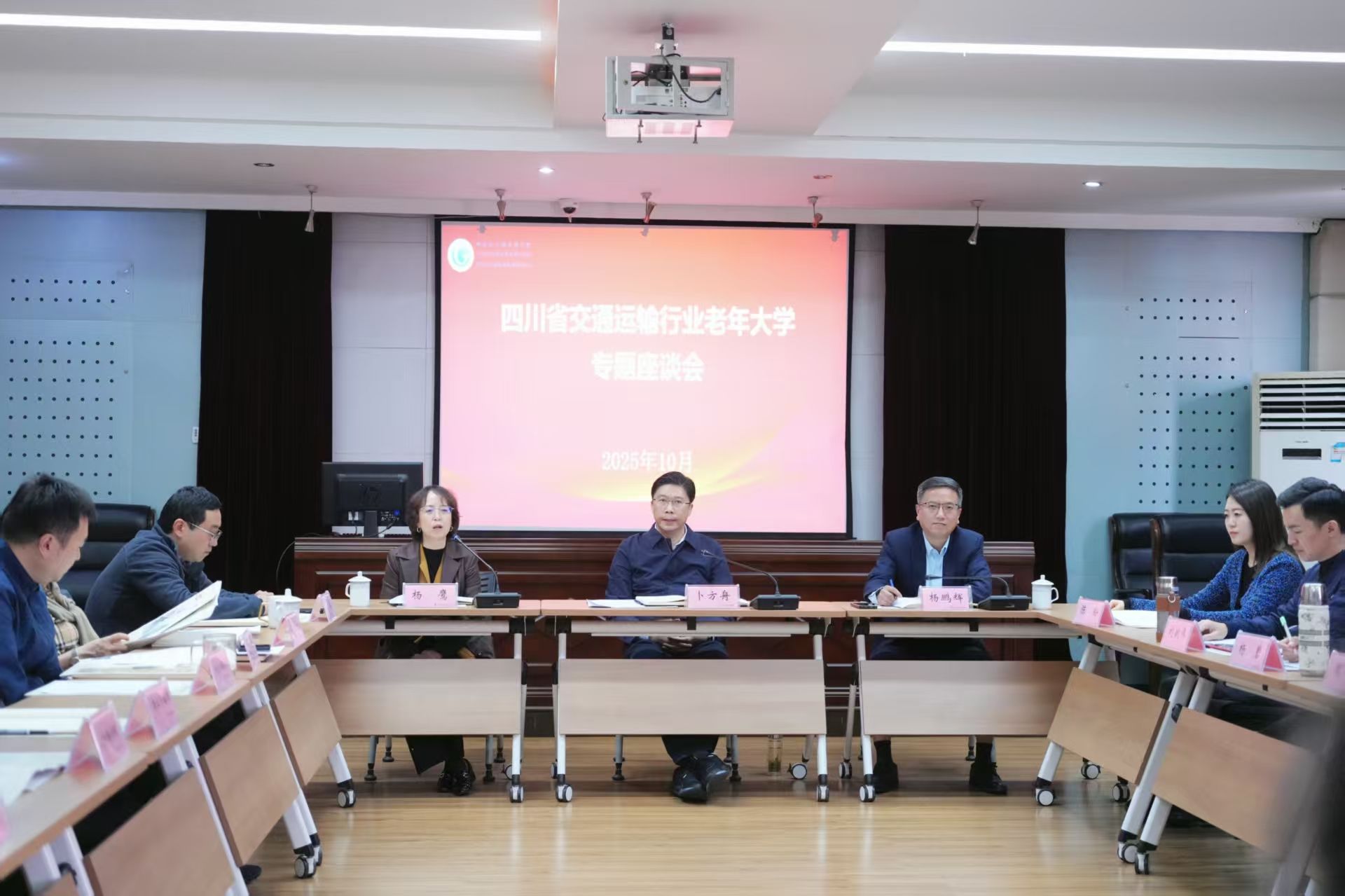 2025年10月22日下午,四川省交通运输行业老年大学专题座谈会在四川省交通管理学校初心楼召开,学校党委书记、交通老年大学校务委员会副主任卜方舟出席座谈会,学校党委副书记、校长、交通运输老年协会常务副会长、交通老年大学工作专班组长杨鹏辉主持会议。会议听取了老年大学在办学规模、开设课程、教学管理、师资队伍建设、服务管理等方面取得的显著进展,与会人员围绕老年大学发展成果与未来规划展开深入交流,共同绘制老年教育发展愿景。