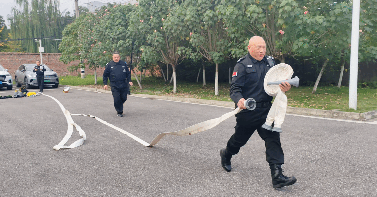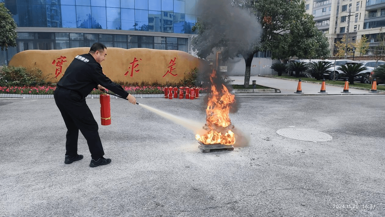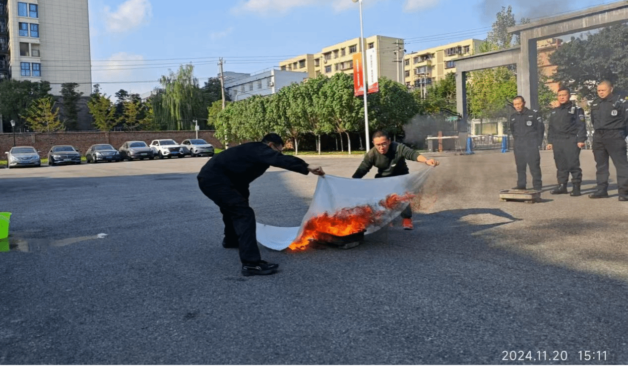 为加强学校消防安全教育工作,提高消防应急能力,我校于11月20日组织安保队开展了一次消防演练技能比赛活动。活动内容包含个人使用干粉灭火器灭火和两人一组铺设水带计时比赛、穿防火服和使用灭火毯灭火演练。