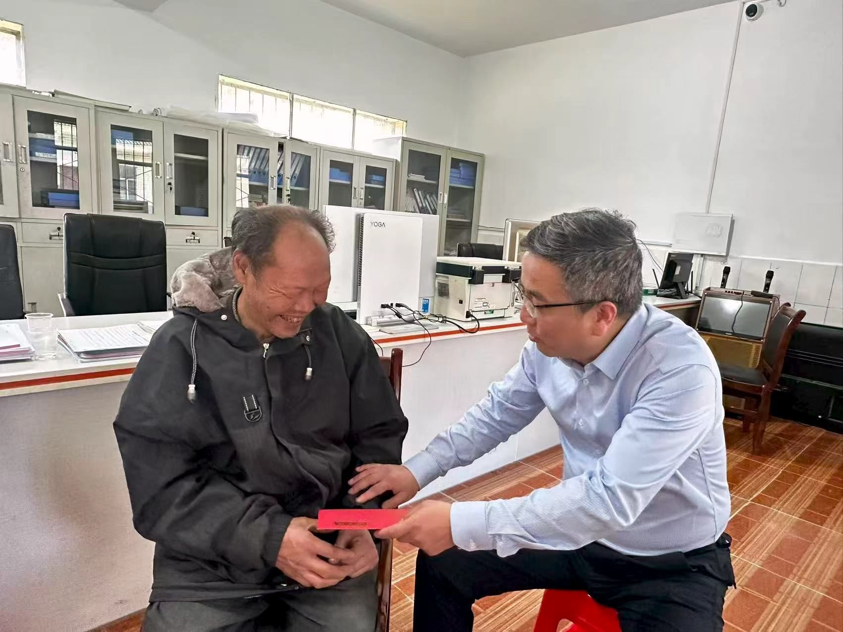 走访入户送温暖,精准帮扶显真情。在驻村干部的带领下,慰问组一行走访慰问重点监测户,在监测户家中,杨鹏辉与监测户促膝长谈,详细了解监测户的收入来源、生活支出、健康状况等方面的情况,并送上慰问金,用通俗易懂的语言向其宣传各项惠民政策,并鼓励监测户要坚定信心,保持乐观向上的生活态度,依靠帮扶政策和勤劳的双手,不断改善家庭生活状况,把日子越过越好。