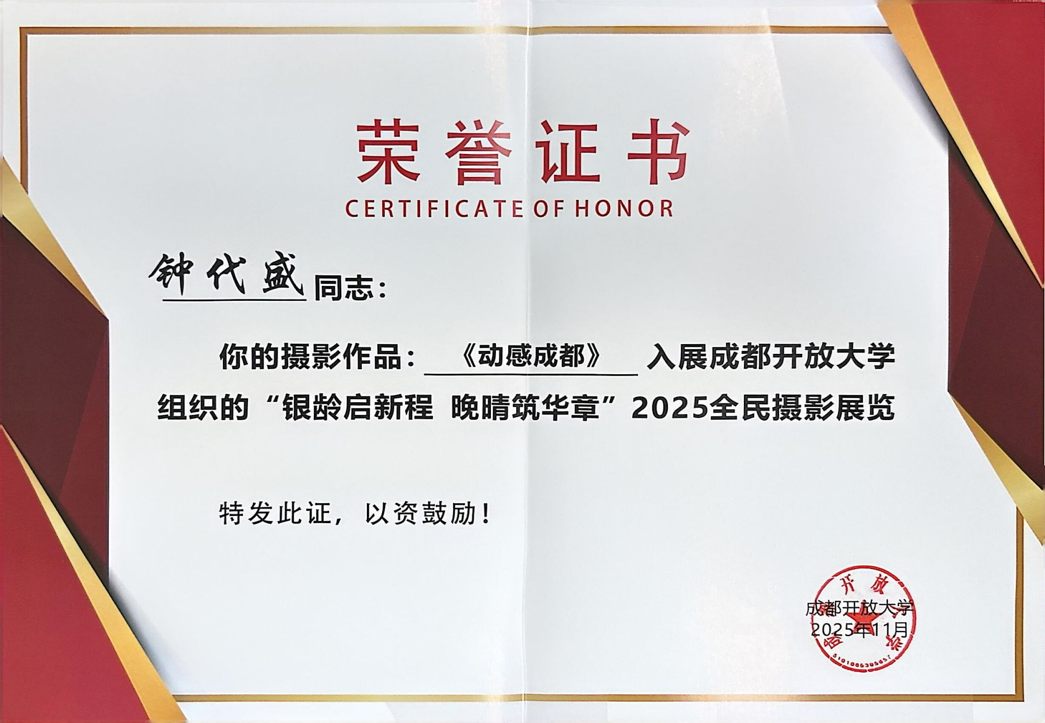 近日,由成都开放大学主办的“银龄启新程 晚晴筑华章”2025全民摄影展圆满落幕。四川省交通运输行业老年大学手机摄影班选送作品斩获佳绩,范卫、吴麟、钟代盛、卢道珍等学员拍摄的作品5幅成功入展、2幅获入围资格,用光影艺术交出了一份亮眼的教学成果答卷,生动诠释了“老有所学、老有所乐、老有所为”的银龄风采。